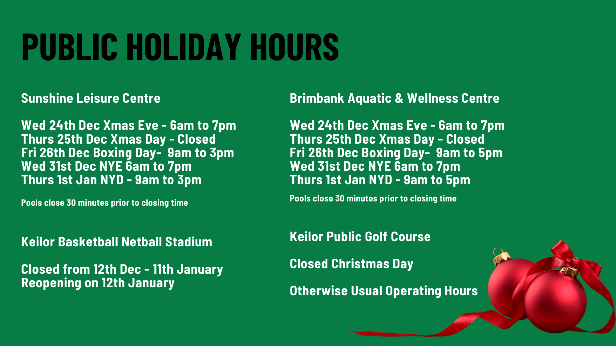 Public Holidays typically 9-5pm (pools close at 4.30pm) unless advertised otherwise.